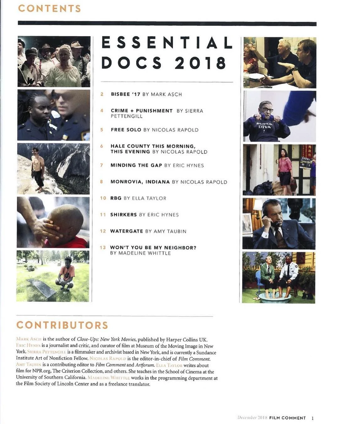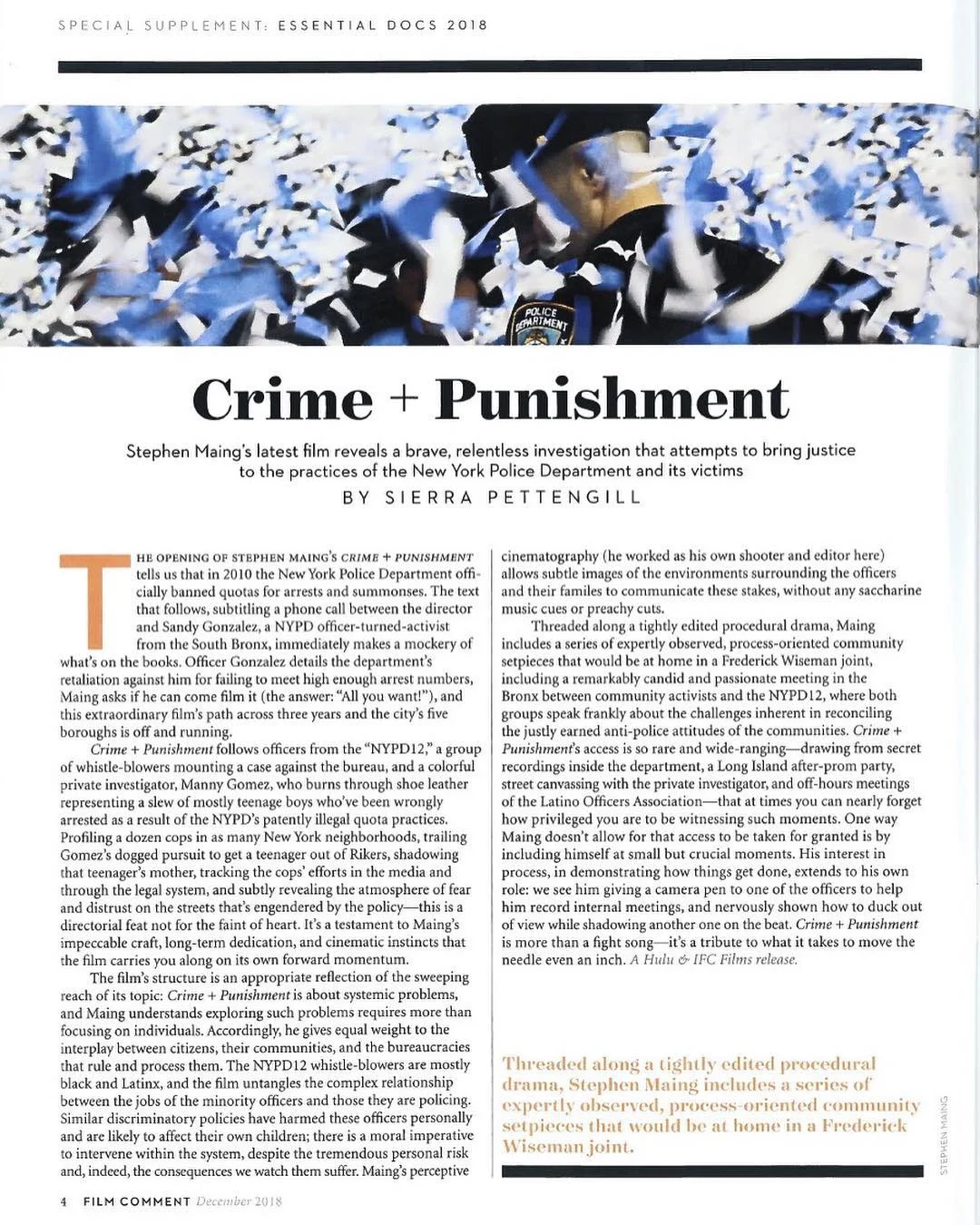 Crime + Punishment is included in the “Essential Docs of 2018” issue of Film Comment magazine, which has always had sharp and interesting reviews and analysis. Huge thanks to Sierra Pettengill for the very thoughtful writing - an extra special honor coming from such a smart filmmaker as herself.
