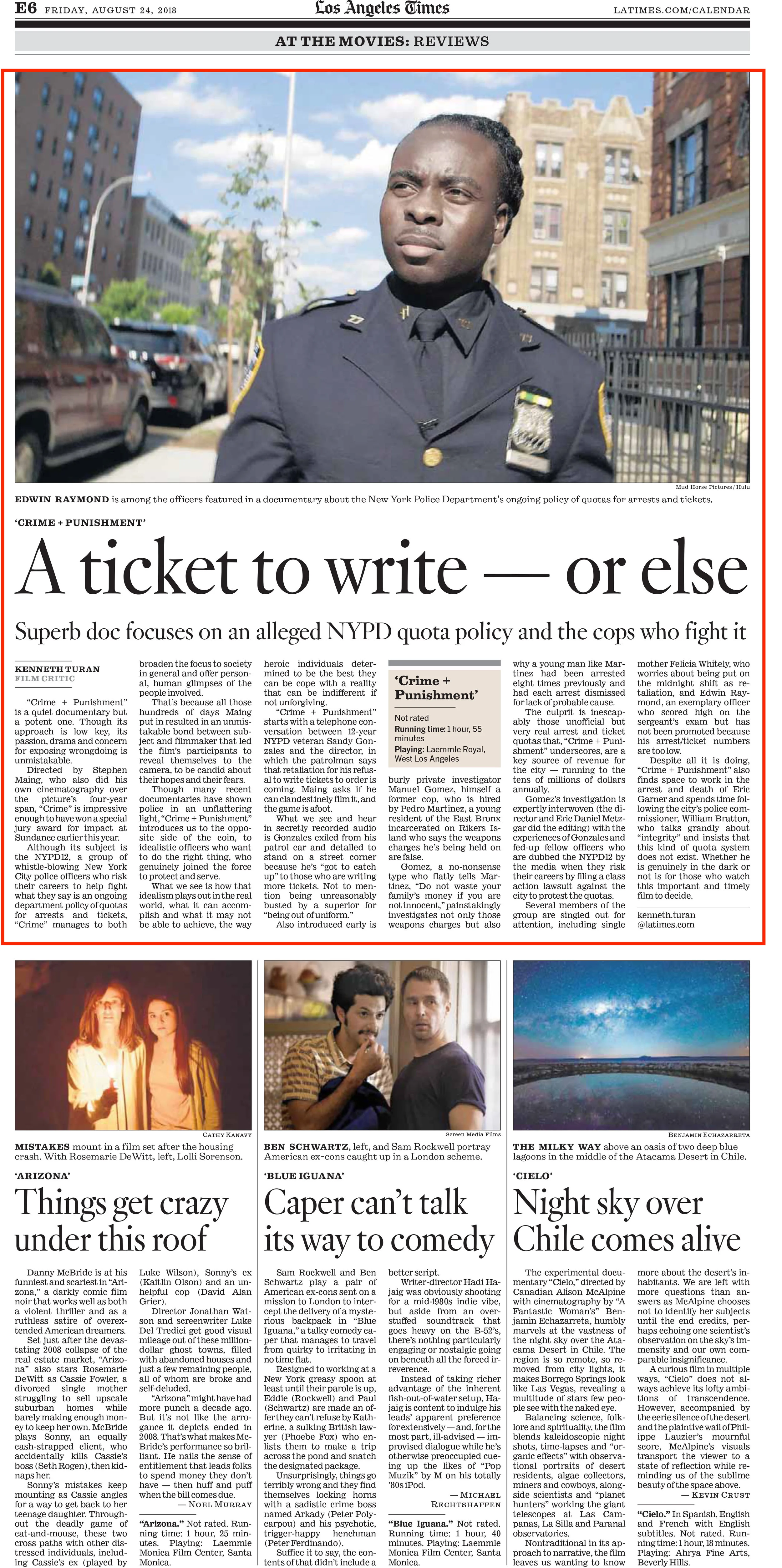 August 24, 2018 Steve Maing Los Angeles Times August 24, 2018 Steve Maing "Superb doc focuses on an alleged NYPD quota policy and the cops who fight it." Thanks Kenneth Turan! Steve Maing